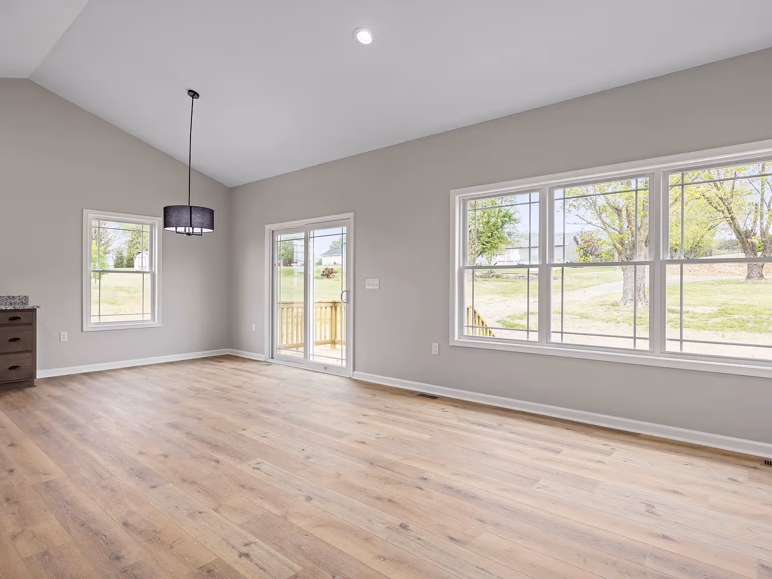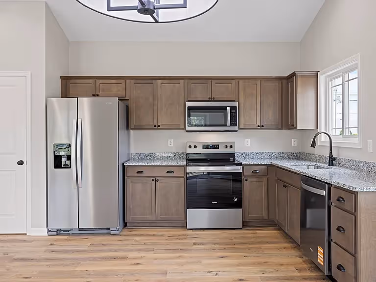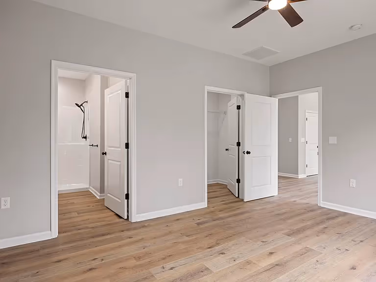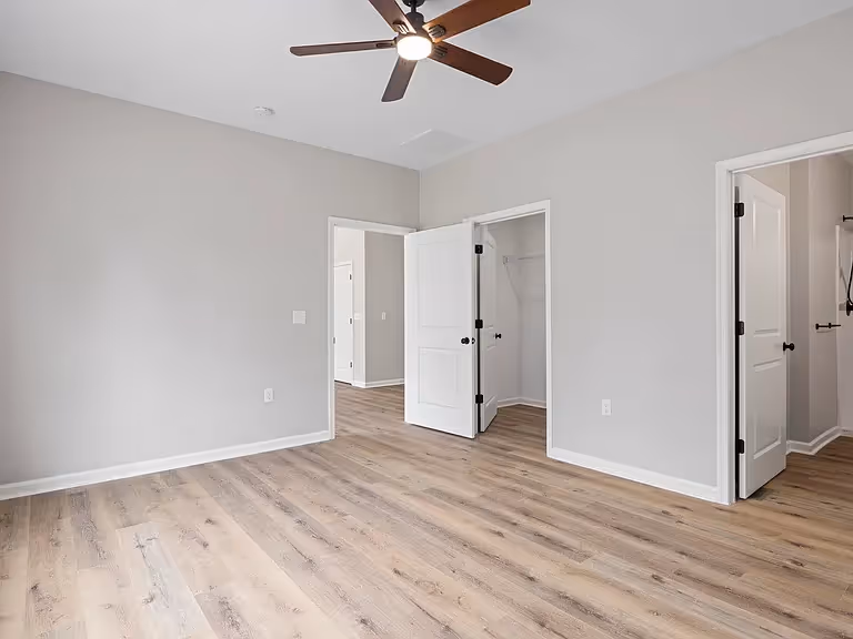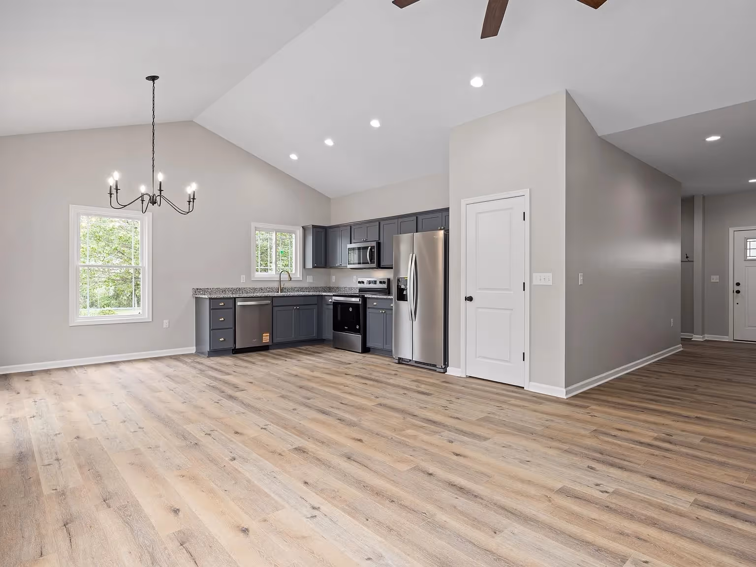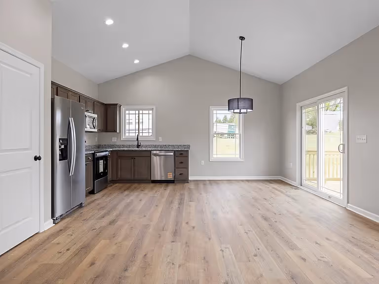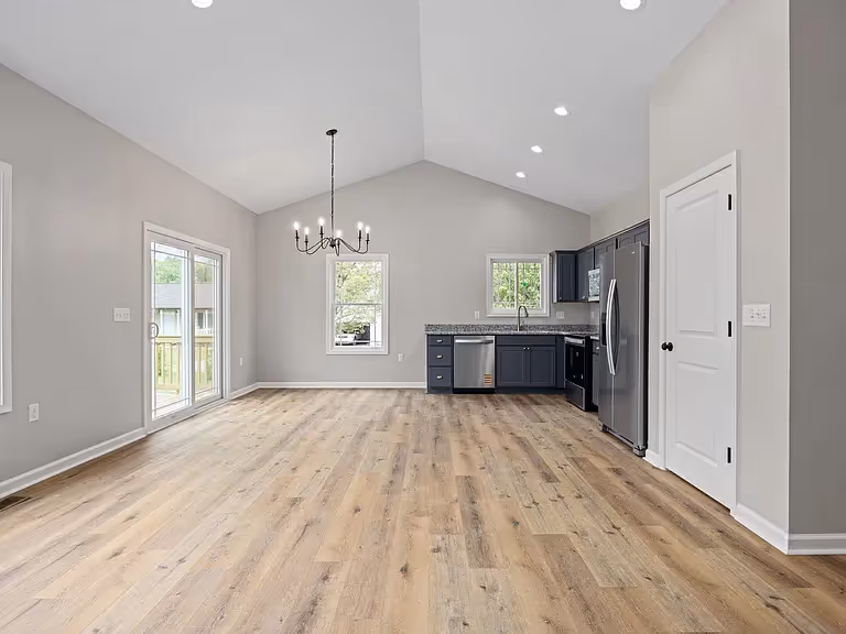 Cozy front door opens into clean entryway leading into an attractive and airy open concept living, dining, and kitchen area. Functional while maintaining a luxurious feel. 3 bed, 2 bath, in single story, with double sink vanity in bathroom and a walk-in closet in the primary bedroom.